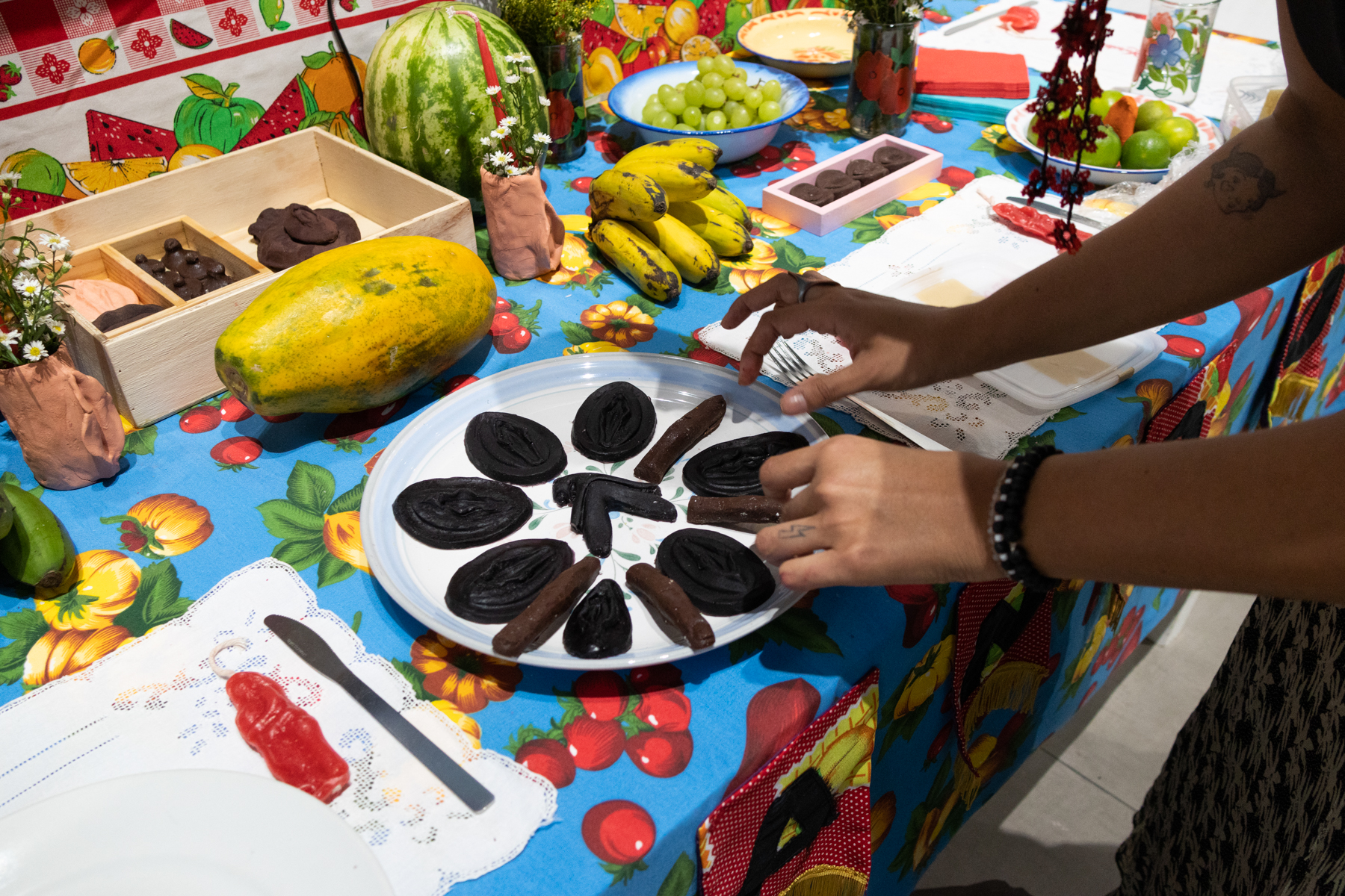 We approach the curation of this exhibition as a narrative of our encounters, embodying ourselves and our histories with the feminist collectives and spaces we are part of and have grown with. In this case, we are eight, but in truth, we are many more. We honor and continue the path of other artists, feminists, mothers, grandmothers, and ancestors who brought us here.